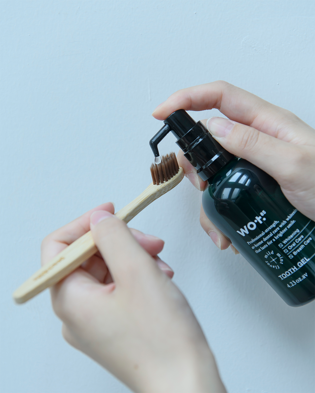 ポンプから適量を歯ブラシにとり、歯と歯間部をブラッシング、歯ぐきをやさしくマッサージします。ブラッシング後は口の中を水でよくすすいでください。